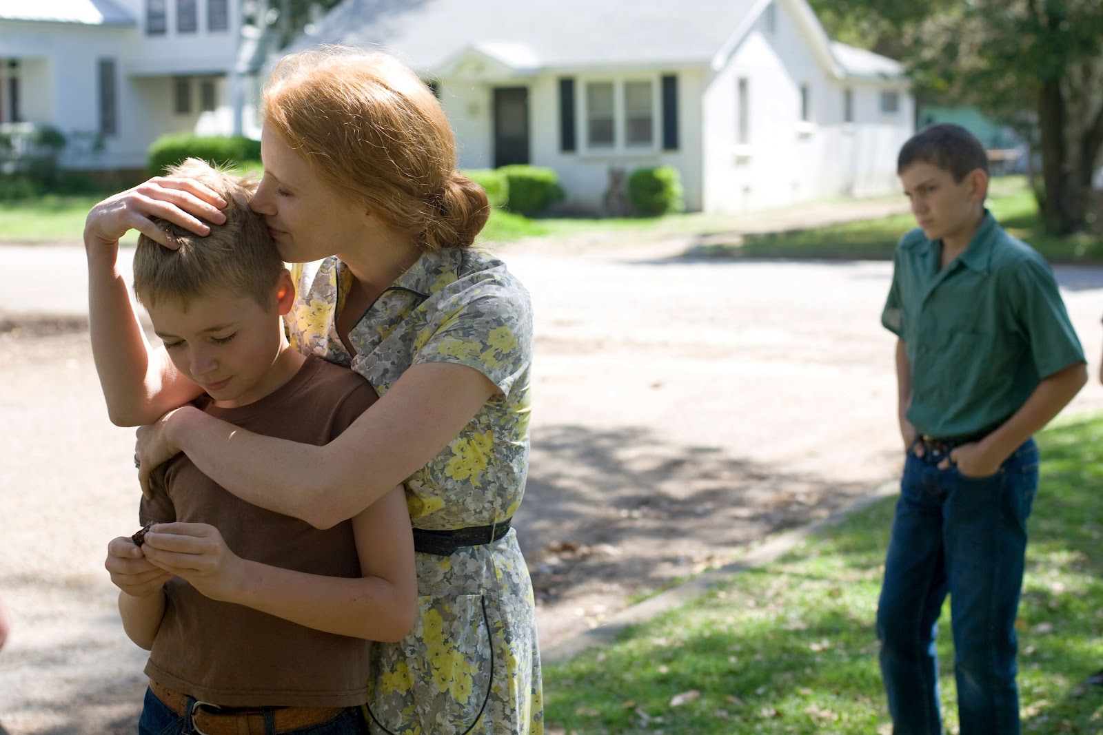 “Do you see this line? Don't cross it!” The father stands in front of the children with a strong stature and strict rules, and in their eyes, he is an enviable and also frightening figure of limits and boundaries, order and authority, and the mother is the opposite point of him, flexible, lively and still a child. If the father wakes up his children to go to church with military seriousness and with a harsh and repulsive behavior, the mother puts ice in Jack's shirt to wake him up, and this is the beginning of laughter and joy. The father's flight was made possible by the industry (airplane), while the existence of the mother's wings made it possible to fly like birds. Coexistence with butterflies and fish, playing with dogs, dancing bubbles in the air, crawling into the embrace of a tree, and graceful rotations in the hands of the mother, ties plant and animal life to Jack's childhood to give the word “mother” a two-way function and dissolve the assurance and calmness of her face in the simple and welcoming image of mother nature. That’s why in the absence of the father, the brothers happily release their hidden energy and giggle freely while playing with mother. The ascetic ethics of paternalism is gathered together in the existence of the father; the mother surrenders to this moral system. After the death of his son, they advise her that "[God] himself gives and he himself takes back" and she has no choice but to submit to what she does not understand; Just as Job never understands why he has to endure all that pain and suffering. In the following, the name of God is interwoven in the figure of a father who is the lawmaker but does not adhere to any law, and disobeying his orders has dire consequences. Over the lunch time he has ordered silence, but he continues to talk until one of the children says what he should not: "Shut up." In this way, the table of food, the point of collision and intersection of religious masks (all demonstrations and rituals of thanksgiving directed to the sky) and human and instinctive needs (nutrition) becomes a dramatic place that clearly reflects the dual plan of The Tree of Life. After the tension that occurs between him and the boys, the father expresses one of the long-standing illusions of the paternalistic society in a conversation with the mother: You have raised my children against me.